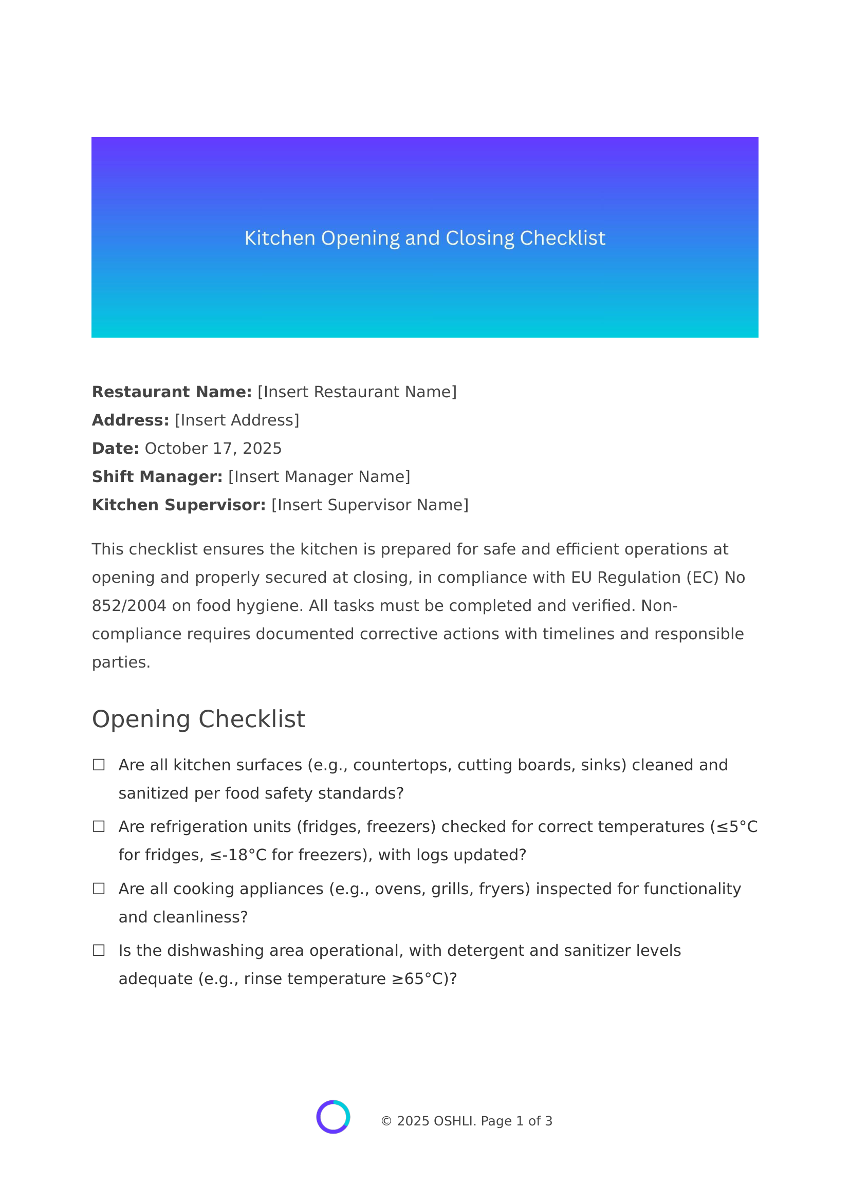 Simplify operations with user-friendly tools. A free kitchen opening and closing checklist can be customized to your kitchen’s needs, available as a kitchen checklist template Excel or kitchen opening and closing checklist PDF. For convenience, try a digital kitchen checklist app for real-time task tracking.